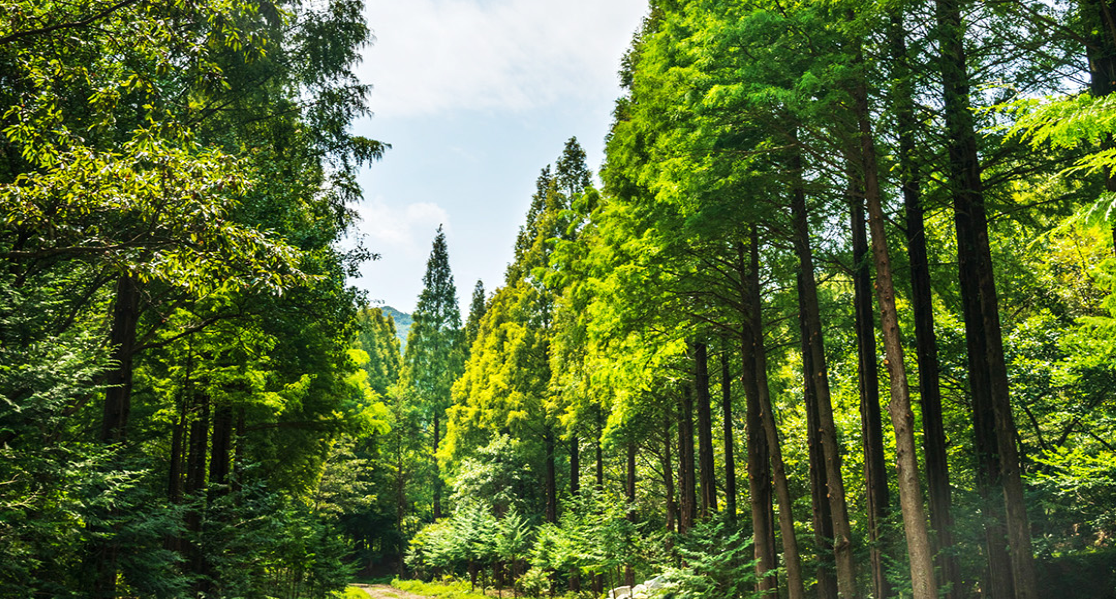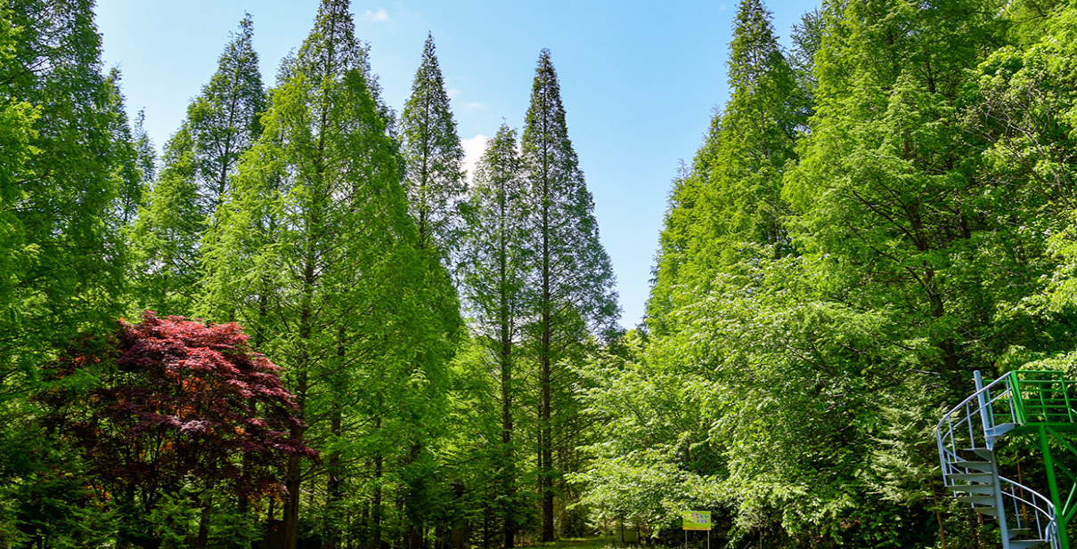 탄소상쇄 숲으로 조성된 이곳은 푸르른 메타세쿼이아 나무들이 하늘 높이 솟아 있고, 잔잔한 호수가 그 옆을 조용히 흐르는 그림 같은 풍경을 자랑합니다.
