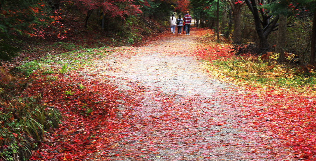 가을: 숲 전체가 황금빛으로 물드는 가을은 온빛자연휴양림이 가장 아름다운 시기입니다. 붉게 물든 낙엽들이 숲길을 따라 흩날리는 모습은 마치 한 폭의 그림 같습니다.