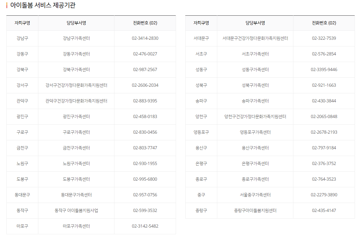 서울에 거주하시는 분들의 경우 영아 전담 아이돌봄 서비스, 등·하원 전담 아이돌봄 서비스 아픈아이 전담 아이돌봄 서비스등 서울형 틈새 아이돌봄 3종 서비스가 진행되고 있으며 각 지자체 마다 어떠한 정책이 있는지 확인해 보시는 것이 좋습니다.