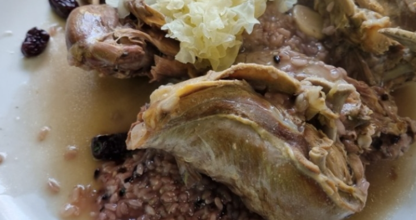 장수촌의 대표 메뉴인 누룽지 닭백숙은 압력솥에 푹 쪄내어 부드러운 닭고기와 구수한 누룽지의 조화가 일품입니다.