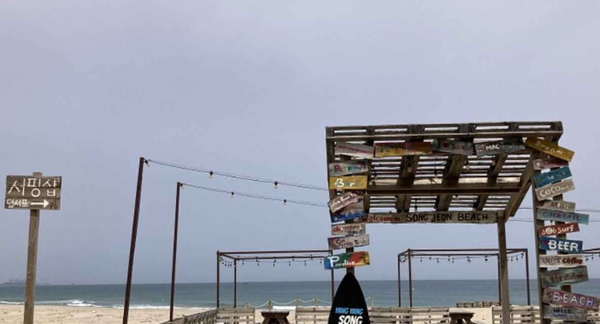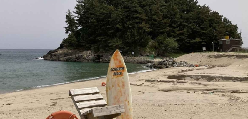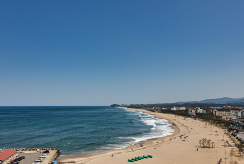 죽도 해변과 인구 해변 사이에 위치한 송전 해수욕장은 비교적 한적하고 조용한 분위기를 즐길 수 있는 해변입니다. 깨끗한 백사장과 얕은 수심으로 가족 단위 피서객에게 적합하며, 서핑 초보자들이 연습하기에도 좋은 곳입니다.