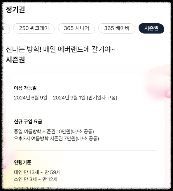 특히 6~8월 여름 휴가철에는 주말은 A 시즌, 평일은 B 시즌으로 운영되는 경우가 많습니다. 정확한 시즌 정보는 에버랜드 홈페이지 시즌 캘린더에서 확인할 수 있으니 꼭 참고하세요!
