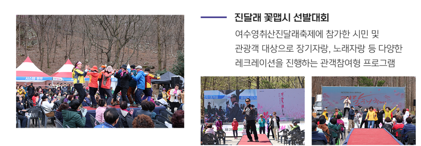 여수 영취산 진달래 축제는 봄의 아름다움을 만끽할 수 있는 특별한 기회를 제공합니다. 다양한 체험 프로그램과 공연이 준비되어 있어, 온 가족이 함께 즐길 수 있는 행사로 자리 잡았습니다.