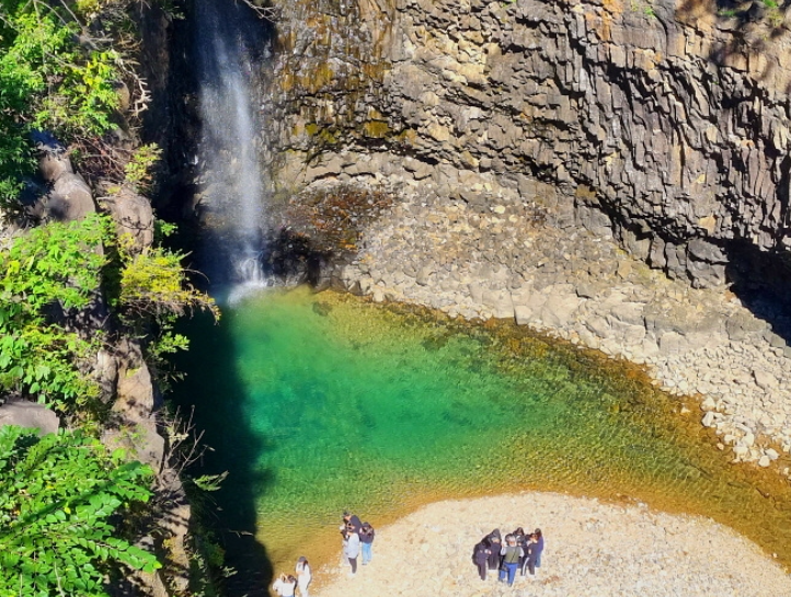 재인폭포는 높이 18m에서 쏟아지는 물줄기는 웅장함을 자랑하며, 폭포 주변을 둘러싼 주상절리 절벽은 자연의 신비로움을 더합니다.