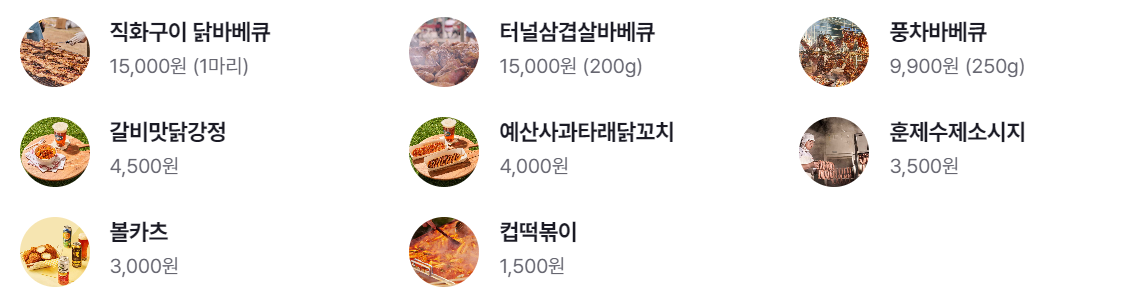 장작구이 통닭바베큐: 장작불에 노릇노릇 구워내 불향 가득 머금은 통닭 바베큐는 겉은 바삭하고 속은 촉촉한 완벽한 조화를 자랑합니다.