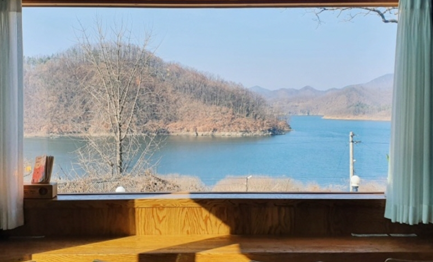 프란스테이션의 가장 큰 매력은 탁 트인 창문 너머로 펼쳐지는 대청호의 풍경입니다. 마치 액자 속 그림 같은 풍경은 잊지 못할 추억을 선사합니다.