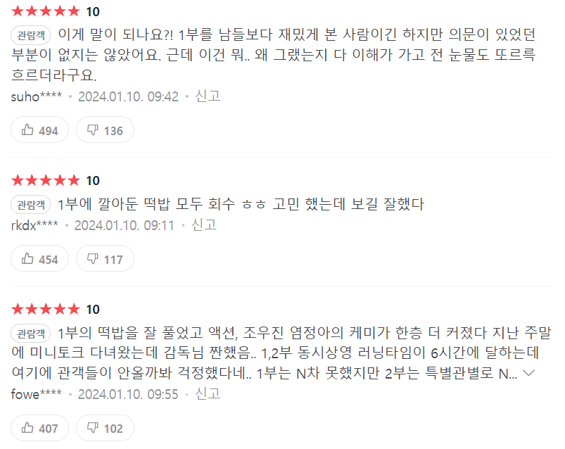 네이버에서는 네티즌 평점 8.84점을 기록중이며 실관람객 평점은 8.52점을 기록하고 있습니다. 한마디로 요약하자면 엄청난 대박까지는 아닐지 모르나 나쁘지 않다는 중박이상의 영화라고 볼수 있습니다.