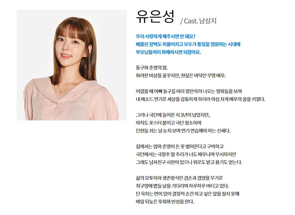 유은성은 28세이며 동구와 춘영의 딸로 나옵니다. 화려한 비상을 꿈꾸지만 현실은 바닥인 무명 배우역할입니다. 시헌의 옛연인이며 은혁과 은아의 여동생이기도 합니다.