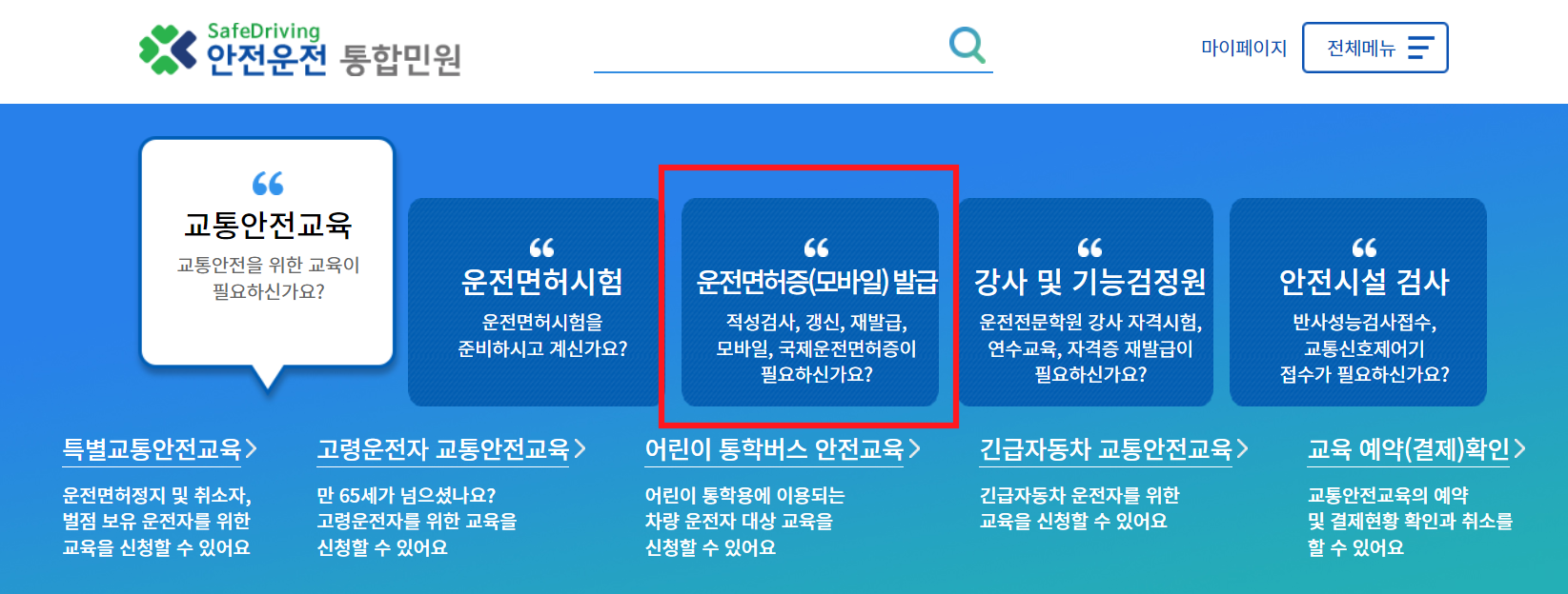 마지막으로 인터넷으로 재발급을 받는 것입니다. 안전운전 통합민원이라는 사이트에 접속을 합니다. 중간에 운전면허증(모바일)발급이라는 곳으로 접속을 하여서 재발급을 눌러줍니다.