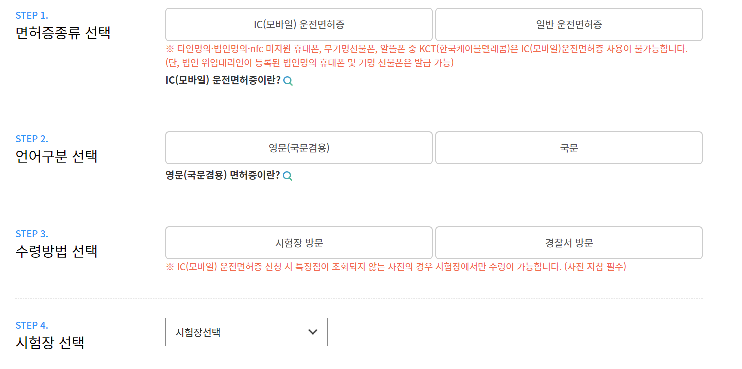 절차는 약관동의, 면허정보확인, 면허증 종류 수령지 날짜선택, 연락처등록, 결제의 순서로서 진행이 됩니다.
