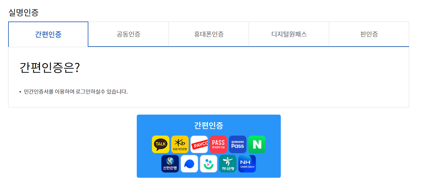 본인 인증을 카카오톡이나 네이버 앱등의 공동인증서를 활용하셔서 진행을 하셔야 합니다. 수수료가 있는데 아래 사진을 참고해 보시기 바랍니다.