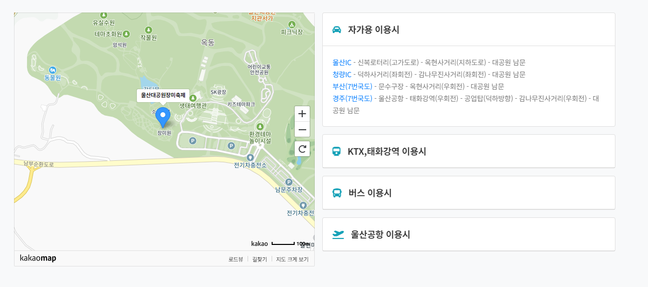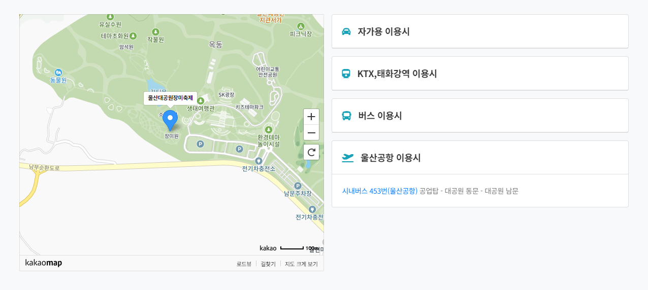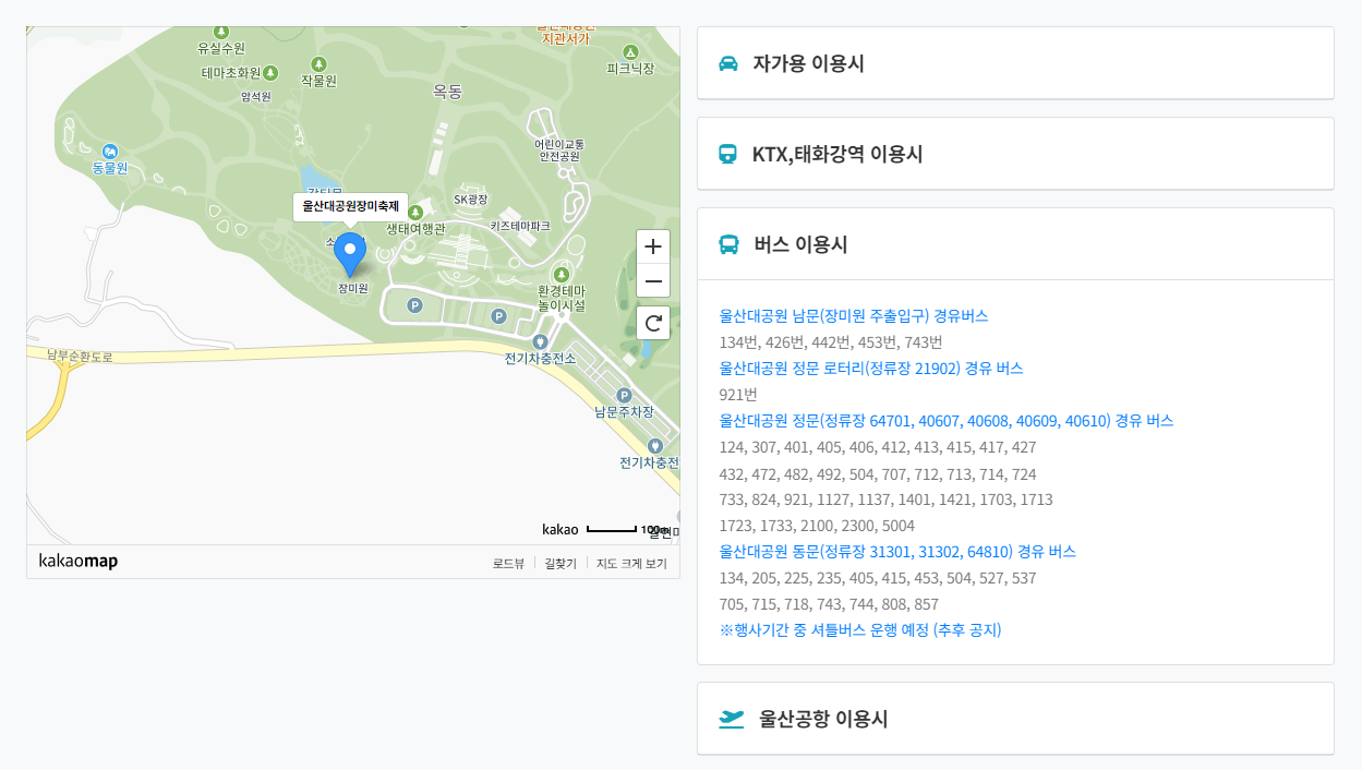 매년 10만 명 이상의 관람객이 모이는 축제인 만큼 주차난 해결을 위해 인근 주차장과 대공원 남문 입구를 순환하는 셔틀버스를 무료로 운행합니다. 자가 이용시 울산대공원 주차장 이용하셔야 하며 유료입니다.