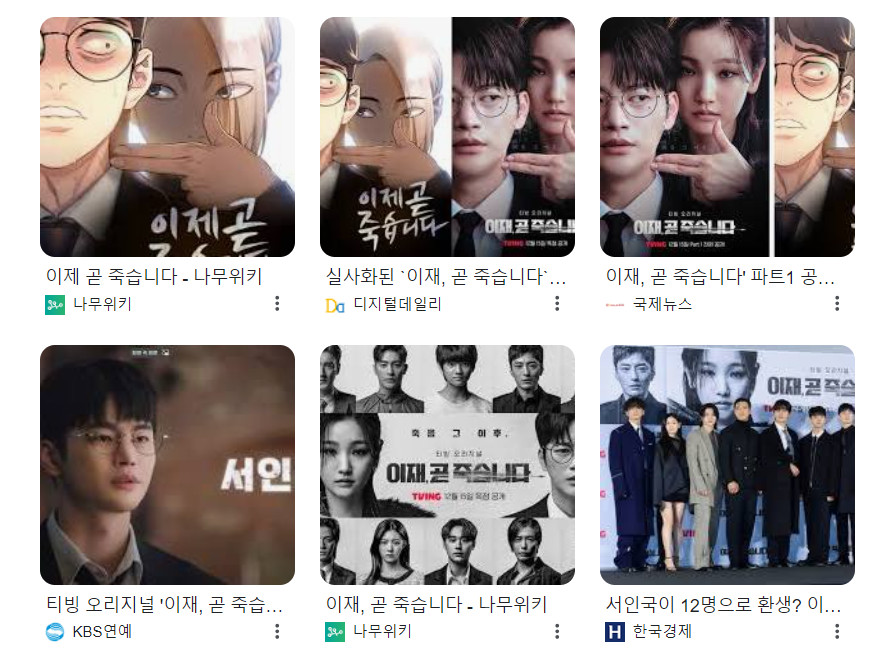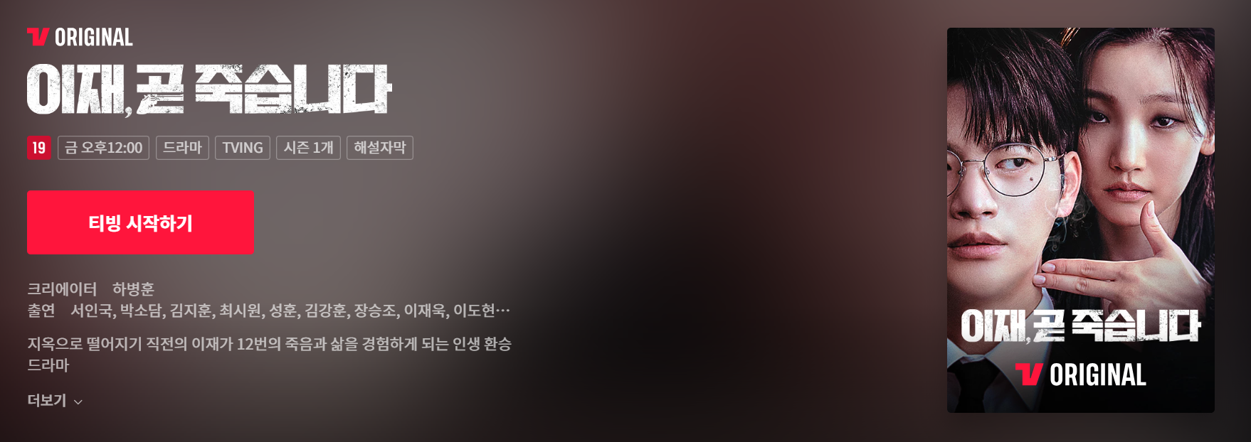 웹툰에 이어서 다음으로 드라마를 살펴보겠습니다. 이재곧 죽습니다 드라마는 앞서 설명드린바와 같이 네이버 웹툰 이제 곧 죽습니다를 기반으로 제작된 TVING 오리지널 드라마입니다.