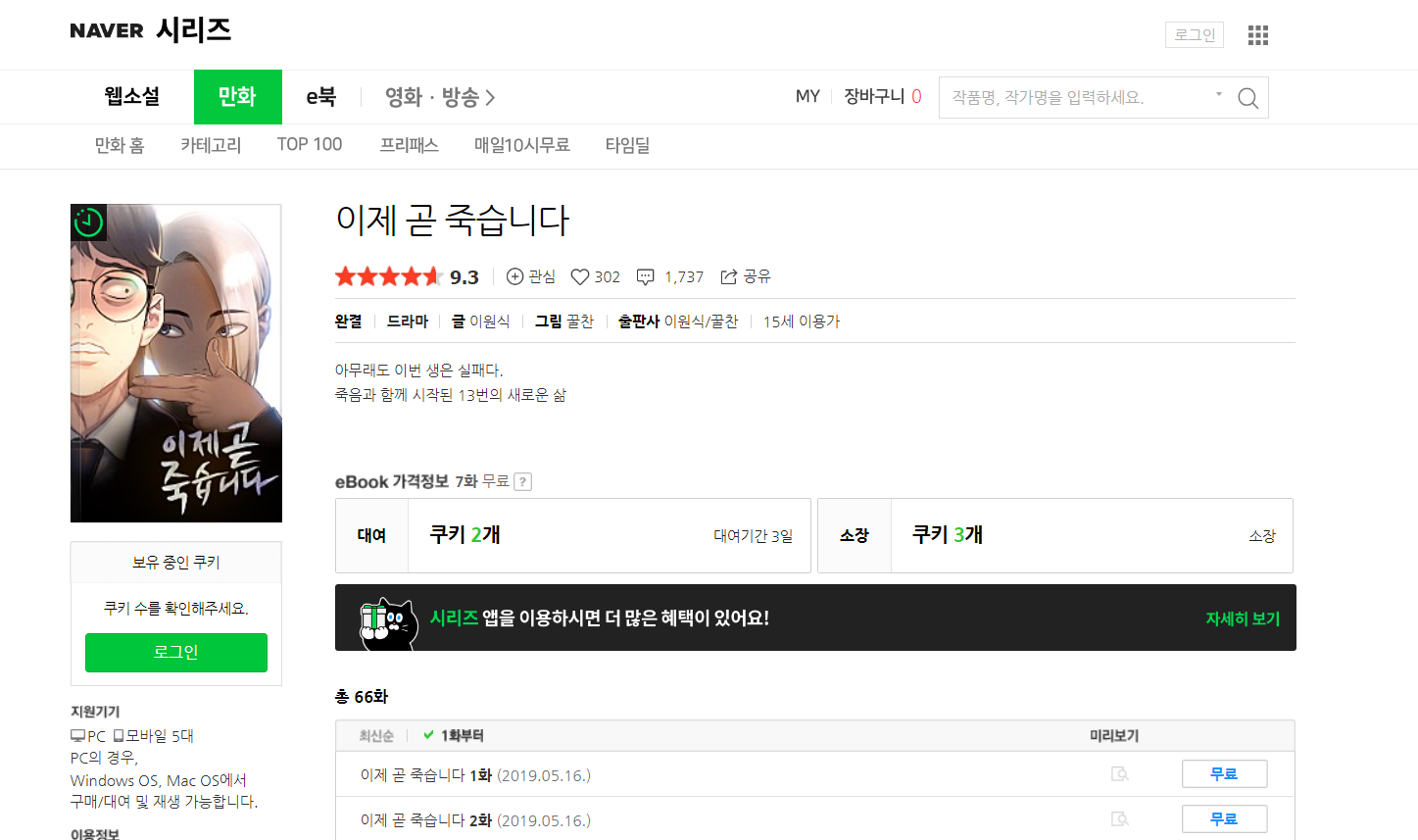 먼저 웹툰부터 안내해 드리겠습니다. 웹툰과 드라마의 제목은 살짝 다른데 드라마는 이재 곧 죽습니다 이지만 웹툰은 이제 곧 죽습니다로 미묘한 차이가 있습니다.