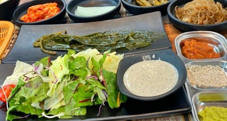 고기와 곁들일 수 있는 버섯 모둠과 야채 모둠도 준비되어 있으며, 상차림비가 있습니다(8세 이하 무료). 기본 상차림에는 육회와 육전, 청국장 등 푸짐한 밑반찬이 제공되며, 추가 반찬은 셀프바를 이용할 수 있습니다. 주소: 경기도 이천시 서이천로 903 1층,2층