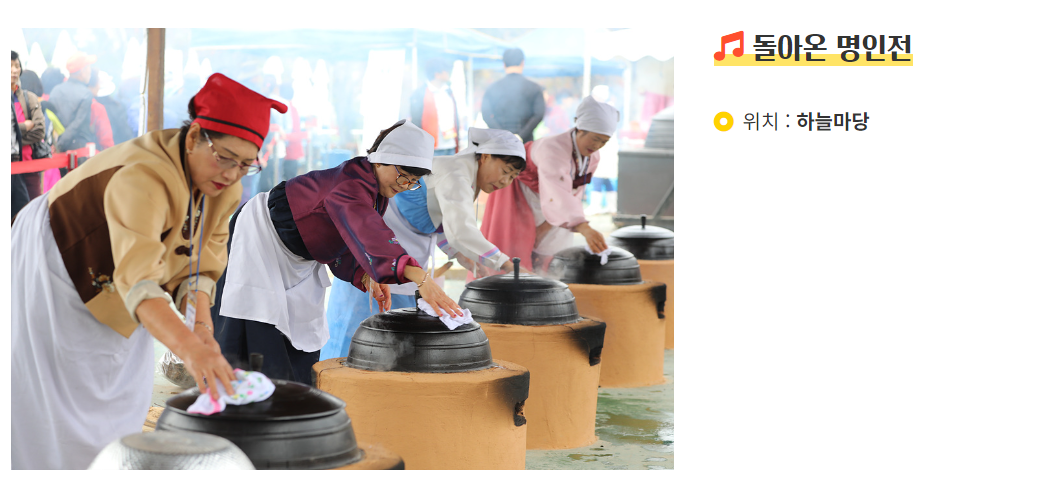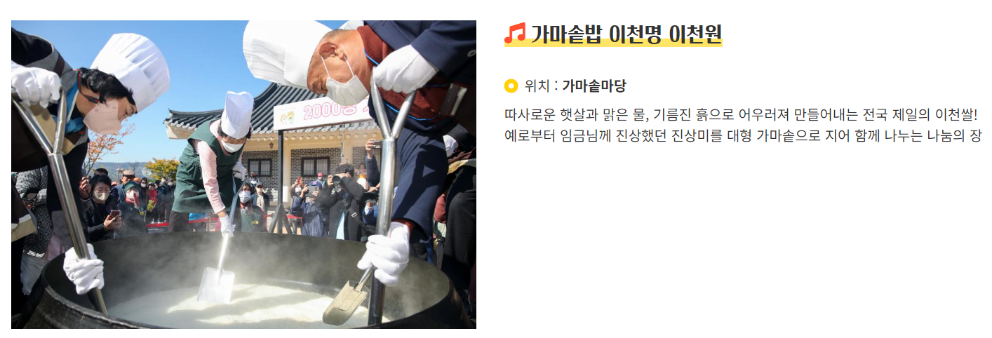 축제의 하이라이트인 2천명 2천원 가마솥밥 프로그램은 초대형 가마솥에서 2천인분의 이천쌀밥을 지어 저렴한 가격에 제공하는 특별한 경험을 선사합니다. 이천쌀로 만든 밥은 쌀알 하나하나가 빛나는 윤기와 함께 고소하고 찰진 맛을 자랑하며, 방문객들은 대형 가마솥에서 지어진 쌀밥의 진정한 맛을 즐길 수 있습니다.