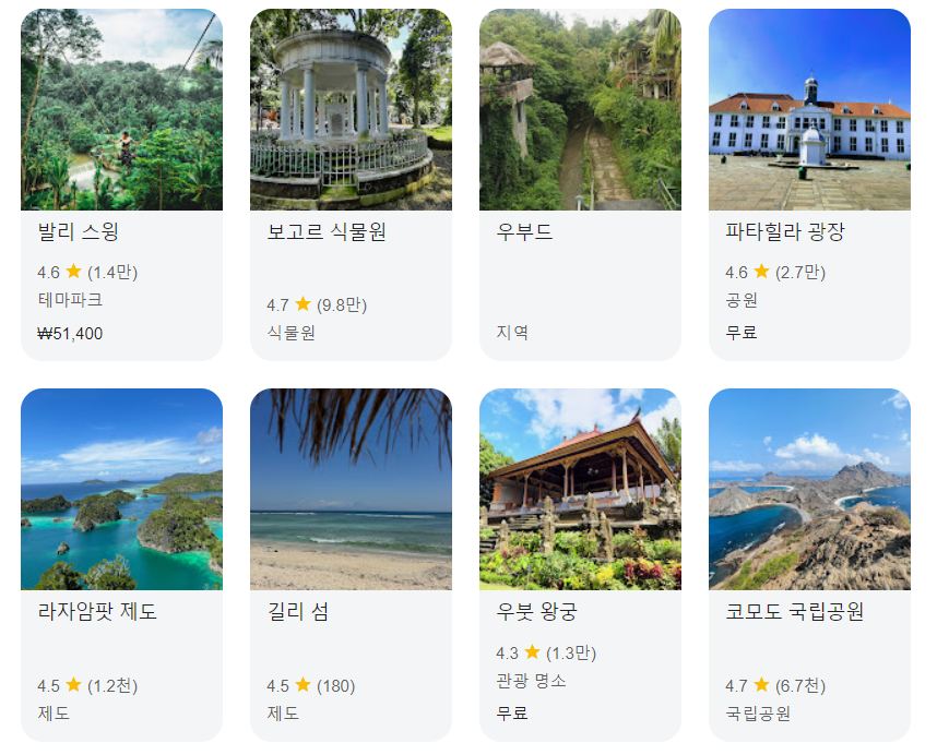 또한 자카르타, 족자카르타, 반둥 등 다른 지역들도 역사 유적지, 문화 체험, 쇼핑 등 다양한 매력을 가지고 있어 한국인 여행객들의 발길을 끌고 있습니다.