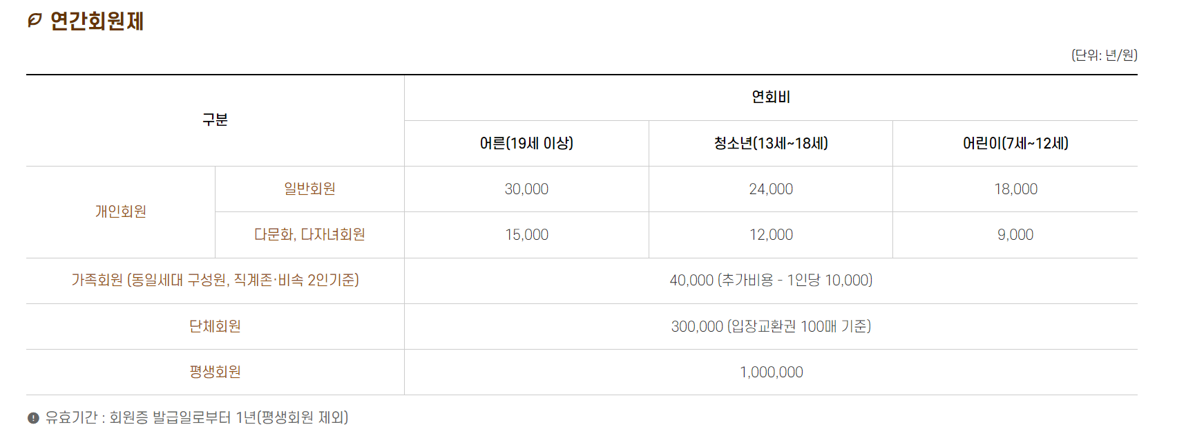 또한 65세 이상이나 6세 이하인 경우 입장료가 면제되고 있습니다. 연간 회원제의 경우 입장료, 교육 문화프로그램등에 할인 혜택 등이 제공되며 요금은 다음과 같습니다.