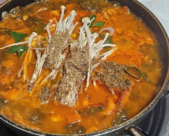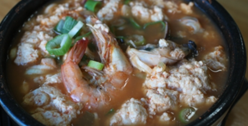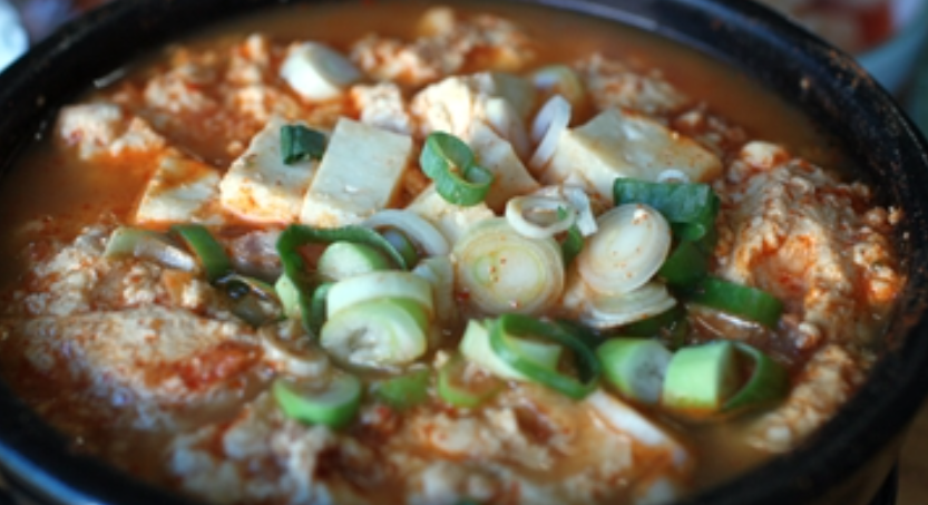 이곳의 대표 메뉴인 치즈 순두부는 팔팔 끓는 순두부찌개 위에 단단한 카사블랑카 치즈를 얹어낸 독특한 음식입니다. 마치 하얀 깍두기처럼 올라간 치즈는 쫀득하면서도 고소한 맛을 자랑하며, 부드러운 순두부와 환상적인 조화를 이룹니다.