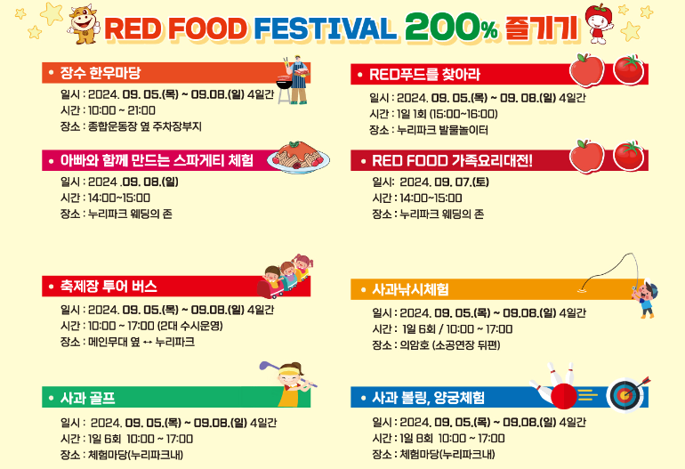 특히 한우마당에서는 2,500석 규모의 셀프식당에서 저렴하게 장수 한우를 맛볼 수 있습니다. 사과마당에서는 장수의 대표 사과인 홍로사과를 비롯한 다양한 제철 농산물을 만나볼 수 있다니 꼭 방문해 보세요.