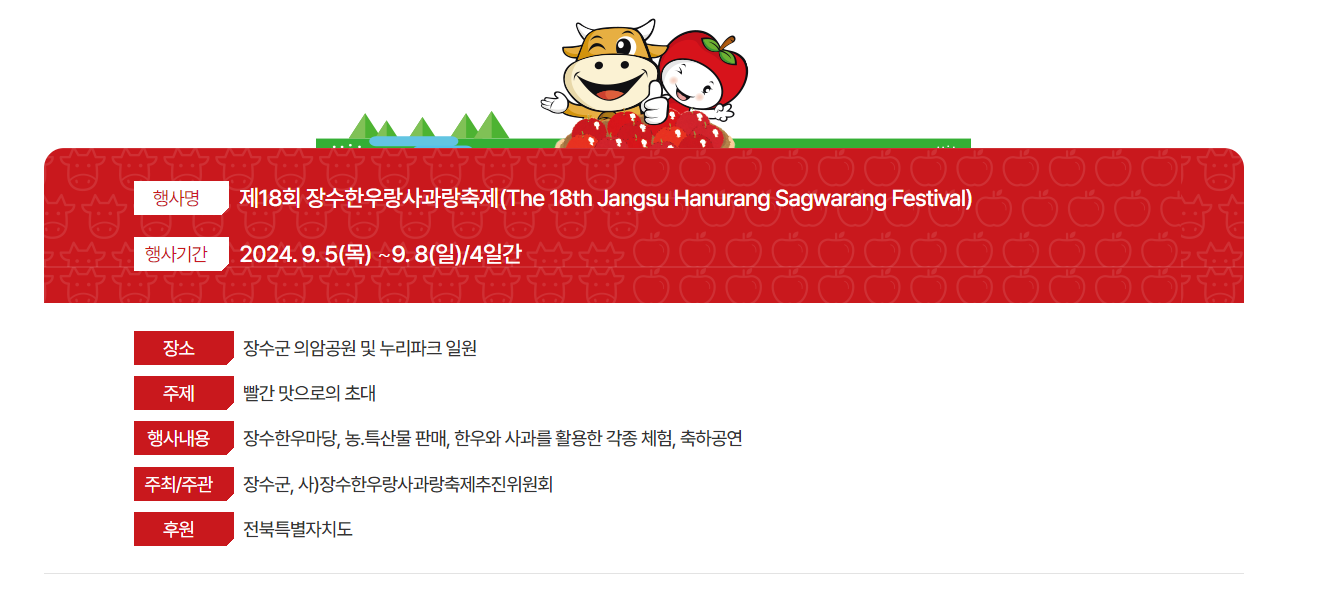 장수 한우랑 사과랑 축제는 장수의 아름다운 자연과 풍성한 농산물을 함께 즐길 수 있는 특별한 기회입니다 가족 친구 연인과 함께 장수로 떠나보세요. 그곳에서 색에 반하고 맛에 취하는 멋진 추억을 만들 수 있을 것입니다.
