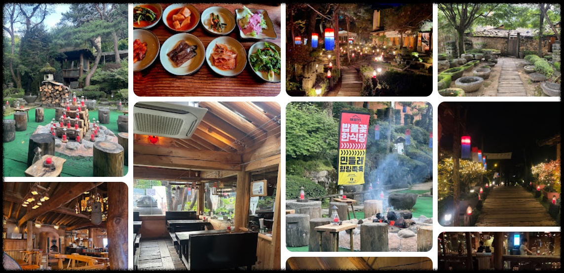 휴양림 입구에 위치한 나들이가든은 닭백숙, 오리백숙 등 보양식 메뉴와 함께 파전, 도토리묵 등 다양한 메뉴를 제공합니다. 넓은 야외 공간과 시원한 계곡을 즐길 수 있어 여름철에 특히 인기가 많습니다.