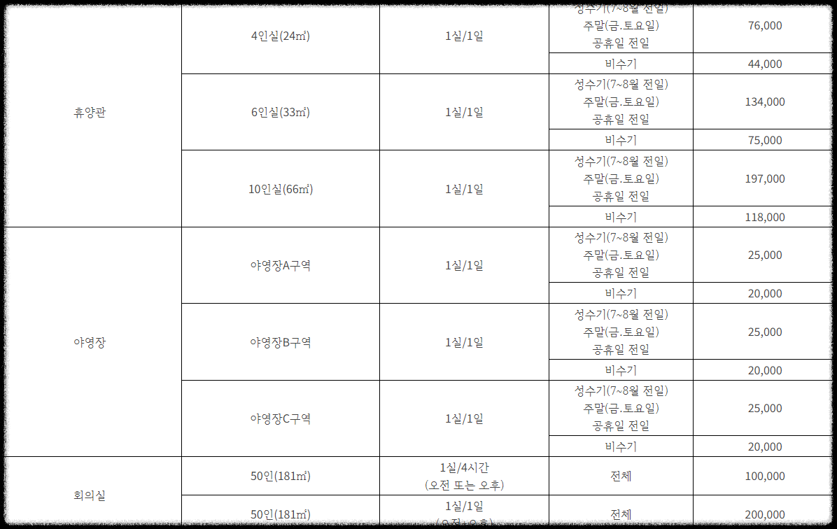 안내해 드리는 사이트에서 시설물에 따라서 가격등을 확인해 보시고 날짜를 지정하시고 가격을 확인하시고 예약을하실 수 있습니다.
