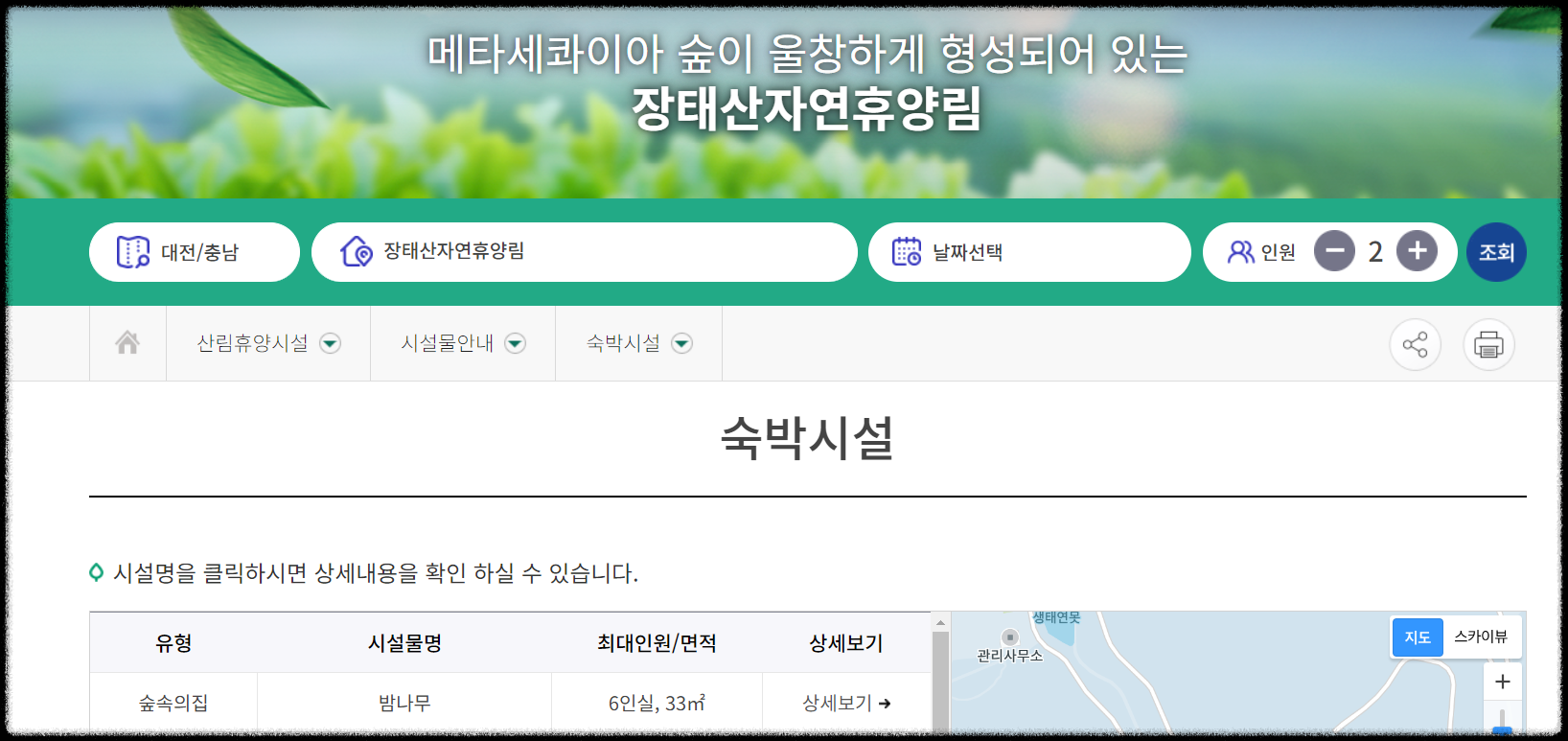 특히 숙박시설로는 통나무집, 산림문화휴양관, 숲속의 집 등 다양한 형태의 객실이 마련되어 있어 취향에 따라 선택할 수 있으며, 숲 속에서 하룻밤을 보내며 자연과 더욱 가까워지는 특별한 경험을 할 수 있습니다.