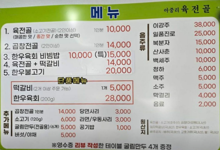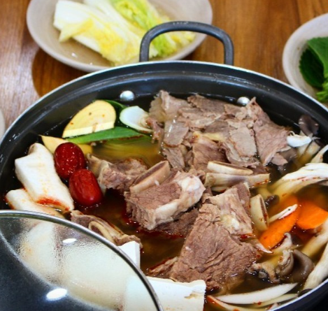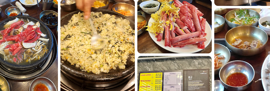 7번 아중리 육전골 본점은 넉넉한 공간과 안정적인 맛으로 꾸준히 사랑받고 있는 식당입니다. 육전골에는 소고기와 다양한 버섯이 풍부하게 들어가 식사의 만족도가 높으며, 모든 메뉴 주문 시 1인 솥밥이 제공되어 한 끼 식사로서의 완성도를 높여줍니다.