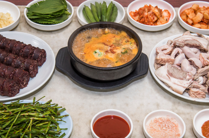순대국밥 안에는 신선한 내장과 머릿고기가 아낌없이 들어가 있어 국물 반 건더기 반이라는 말이 어울릴 정도로 푸짐하며 함께 나오는 부추무침을 국물에 듬뿍 넣어 먹으면 그 맛이 더욱 배가됩니다. 주말이면 시장 복도까지 긴 줄이 늘어서지만 회전율이 빨라 기다릴 만한 가치가 충분하며 포장 주문도 활발하게 이루어지는 곳입니다.