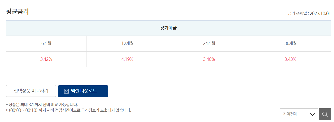 원하시는 조건을 필터링 한후에 내림차순으로 보시면 순위 확인이 가능합니다. 포스팅 작성 시점인 2023년 10월 기준으로 정기예금의 경우 평균적으로 6개월 3.42%, 12개월 4.19%, 24개월 3.46%, 36개월 3.43%의 지표를 보여주고 있습니다.