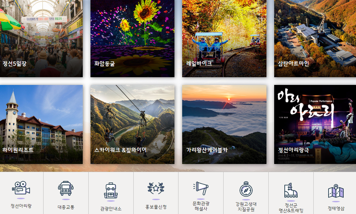 이외에 병방치 스카이워크, 아우라지 관광지, 덕산기계곡등 다양한 명소들이 있습니다. 이러한 정보는 정선에서 운영하는 국민고향정선 홈페이지를 방문하시면 보실 수 있습니다.