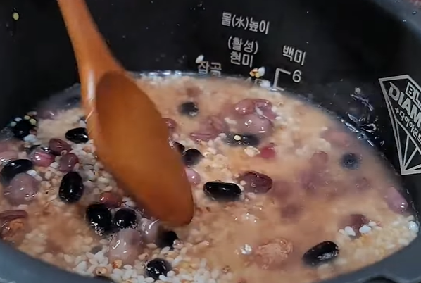 밥 짓기 시작: 압력밥솥을 이용해 밥을 짓는 동안 모든 곡식이 고루 익고, 그 고소한 향이 퍼지며 오곡밥의 특징적인 맛을 더합니다.