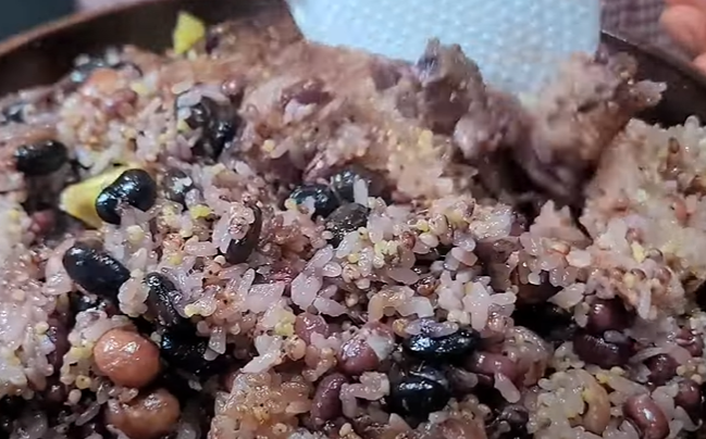 밥이 다 지어지면, 젓가락이나 밥주걱을 이용해 부드럽게 섞어줍니다. 이때 곡식들이 잘 섞여야 각 곡식의 맛이 고루 퍼져 맛있는 오곡밥을 즐길 수 있습니다.