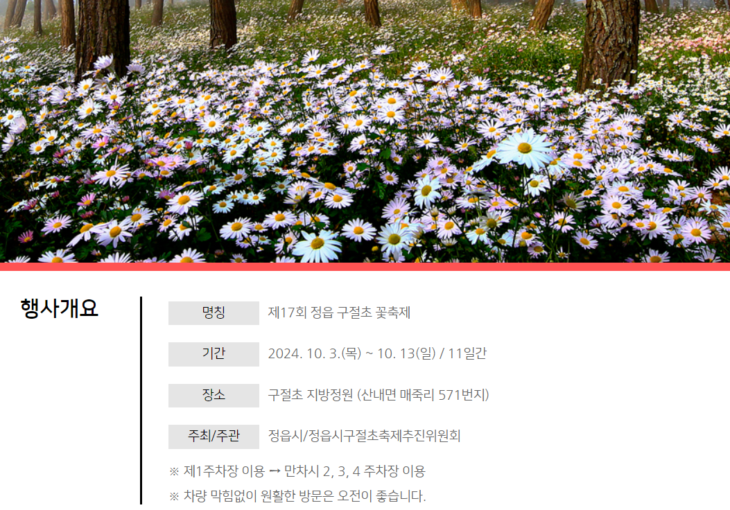 정읍 구절초축제 기간이 다가오면서 많은 분들의 관심을 받고 있으며 이번 글에서 구철초 소개와 더불어서 2024년도 개최되는 축제 정보를 자세하고 상세히 안내 드립니다.