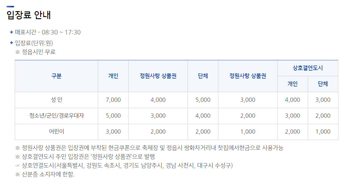 상호 결연 도시(서울특별시, 속초시, 남양주시, 사천시, 대구광역시수성구) : 성인 4,000원(정원사랑상품권 4,000원), 청소년군인경로우대자 3,000원(정원사랑상품권 3,000원), 어린이 2,000원(정원사랑상품권 2,000원) / 단체: 성인 3,000원(정원사랑상품권 3,000원), 청소년군인경로우대자 2,000원(정원사랑상품권 2,000원), 어린이 1,000원(정원사랑상품권 1,000원)