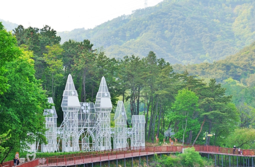 충북 제천 비룡담 저수지는 제2의림지라고도 불리는 아름다운 저수지입니다. 울창한 숲으로 둘러싸여 있으며, 유럽풍의 하얀 성 모양 구조물이 있어 마치 동화 속에 들어온 듯한 느낌을 줍니다.