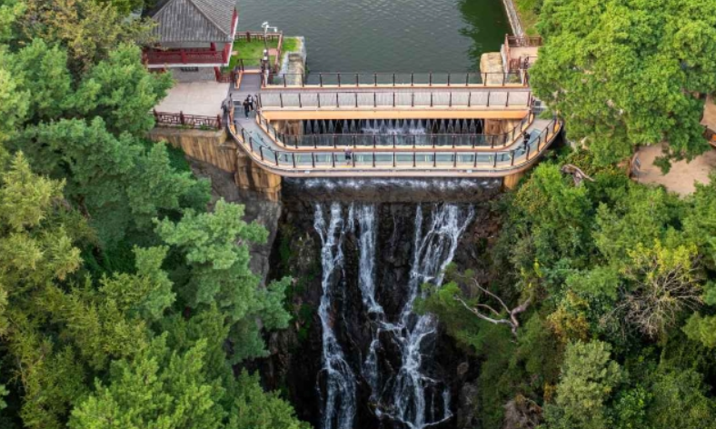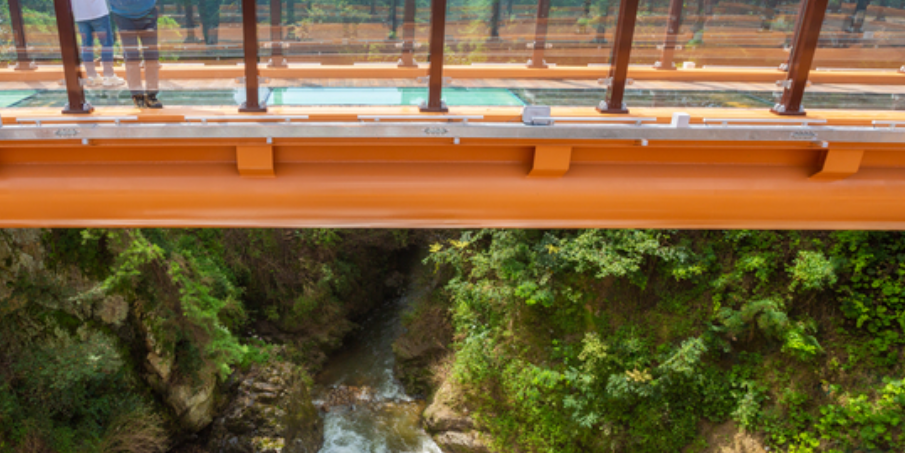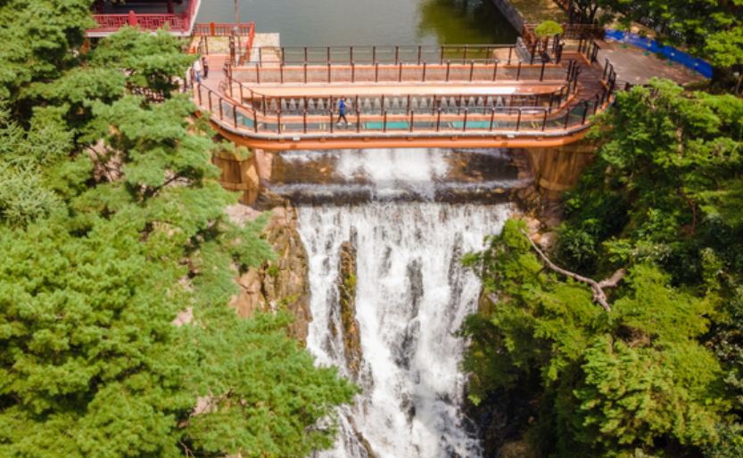 투명한 유리 바닥으로 된 전망대에 서면 폭포수가 발밑으로 떨어지는 아찔한 광경을 볼 수 있습니다. 용추폭포의 웅장함과 아름다움을 새로운 시각에서 감상할 수 있습니다.