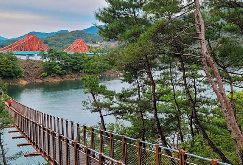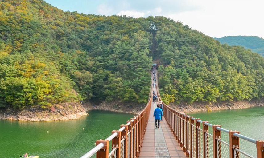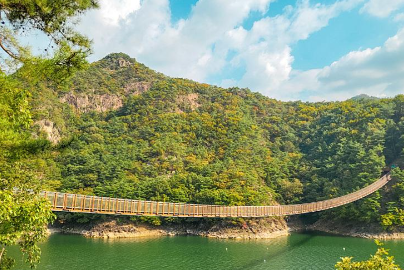 특히 가을 단풍 시즌에는 더욱 아름다운 풍경을 즐길 수 있습니다. 222m 길이의 다리를 건너며 아찔한 스릴을 경험할 수 있으며 주차장과 연결된 데크로드를 따라 이동하면 쉽게 출렁다리에 도착할 수 있습니다.