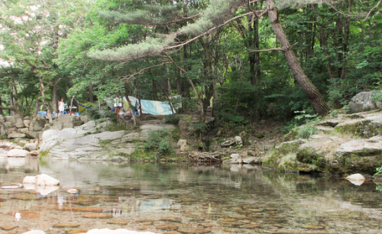 송계계곡은 수심이 얕고 물살이 완만하여 아이들과 함께 물놀이를 즐기기에 좋습니다. 계곡 곳곳에는 평평한 바위와 모래사장이 있어 휴식을 취하기에도 좋습니다.