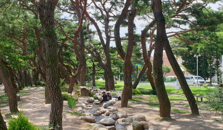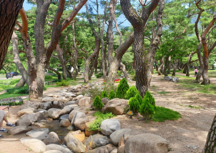 수령이 오래된 소나무들이 빽빽하게 들어서 있어 시원한 그늘과 상쾌한 공기를 제공합니다. 인공적인 시설물을 최소화하고 자연 그대로의 모습을 보존하여 편안하고 아늑한 분위기를 느낄 수 있습니다.