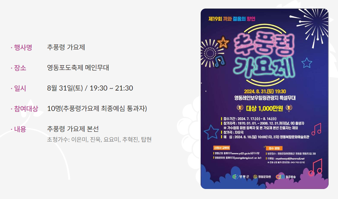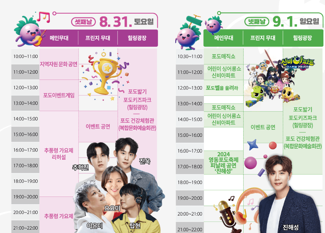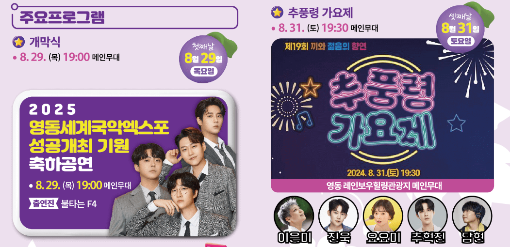 다음날에는 가수 디에이드, 21학번이 출연합니다. 셋쨰날 추풍령 가요제는 영동포도축제 메인무대 8월 31일(토)열리며 이은미, 요요미, 탑현, 추혁진이 출연하며 넷쨰날에는 진해성 가수가 나와서 기대감이 큽니다.