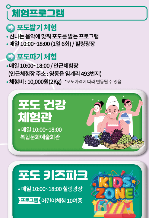 축제의 하이라이트는 싱싱하고 맛있는 영동 포도를 저렴하게 구매할 수 있는 포도 판매와 포도 따기, 포도 밟기, 와인 만들기 등 다양한 체험을 통해 포도의 매력에 푹 빠져볼 수 있는 체험 프로그램, 그리고 온 가족이 함께 참여하며 즐거운 추억을 만들 수 있는 소비자 참여 프로그램이라고 볼수 있습니다.