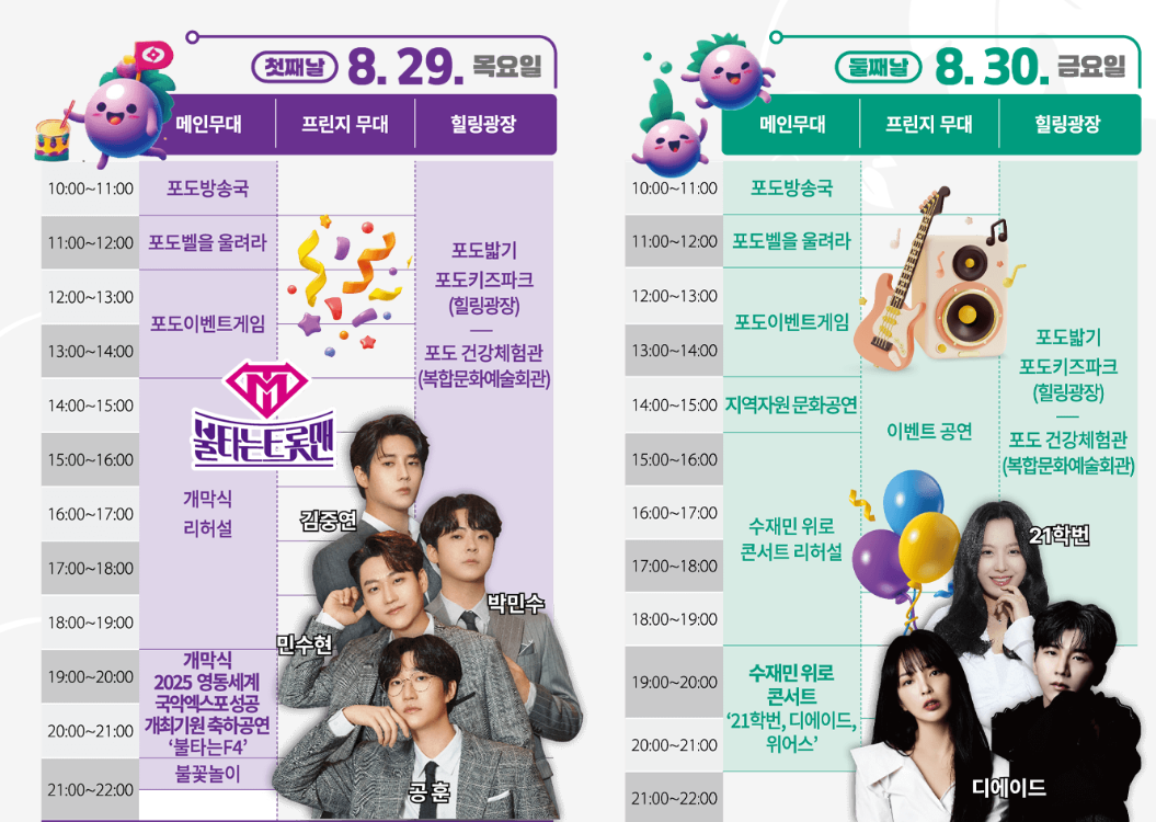 게다가 개막식, 유공자 시상식, 포도왕 시상식, 2025 영동세계국악엑스포 성공개최 기원 콘서트, 수재민 위로 콘서트, 읍면 포도 판매장, 와인 판매장, 농·특산물 판매장, 포도 건강 체험관, 우수 과일 전시관,
