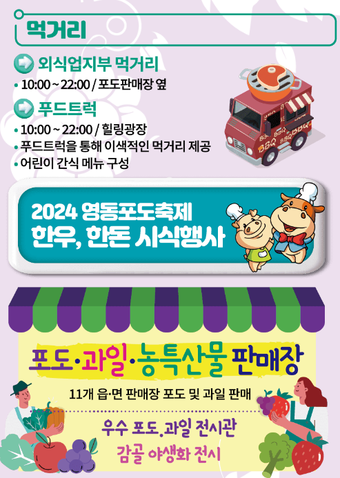 특히, 수도권에서 멀지 않아 당일치기 여행으로도 충분히 즐길 수 있다는 점도 큰 매력입니다. 축제의 하이라이트는 싱싱하고 맛있는 영동 포도를 저렴하게 구매할 수 있는 포도 판매가 진행됩니다.