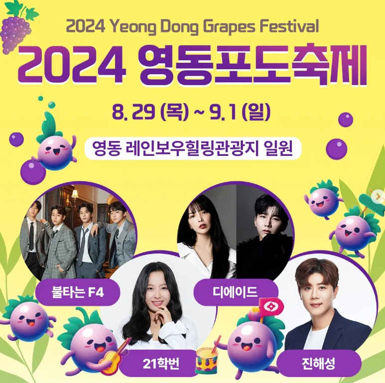 2024년 8월 29일부터 9월 1일까지 4일간 충청북도 영동군 영동 레인보우힐링관광지 일원에서 열리는 영동포도축제는 무료로 입장 가능하며 (일부 체험 프로그램은 유료),