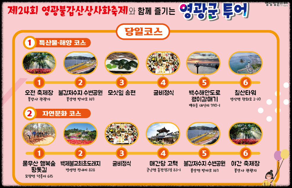 주변 관광지와의 연계: 불갑산 주변에는 백수해안도로, 법성포 굴비거리, 백제 불교 최초 도래지 등 다양한 관광지가 있어 상사화축제와 함께 영광 여행을 더욱 풍성하게 즐길 수 있습니다.