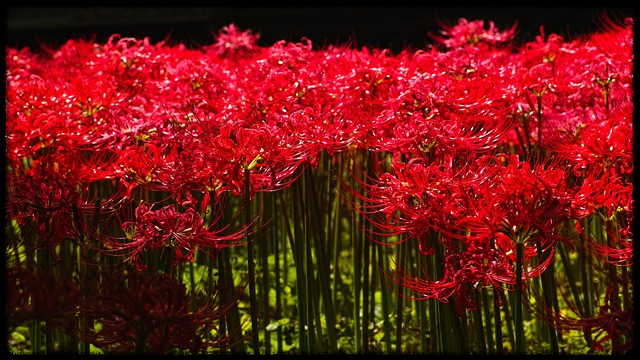 상사화는 여러 종류가 있으며, 대표적으로 붉은 꽃무릇(석산)이 있습니다. 붉은 꽃무릇은 9월 중순경에 만개하며, 푸른 숲과 대비되는 강렬한 붉은색으로 아름다운 풍경을 자아냅니다.