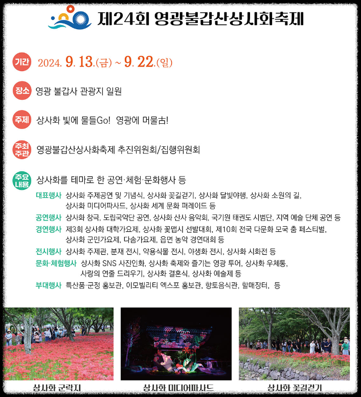 제24회 영광 불갑산 상사화축제는 올해도 상사화가 만개하는 시기에 맞춰 9월 13일부터 22일까지 열리며, '상사화 빛에 물들GO!, 영광에 머물古!'라는 주제로 다양한 프로그램이 마련되었습니다.