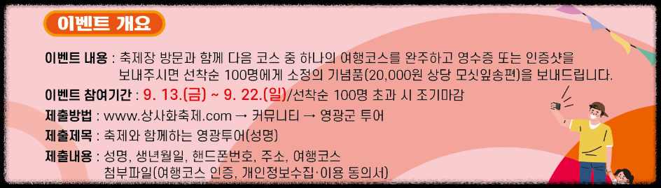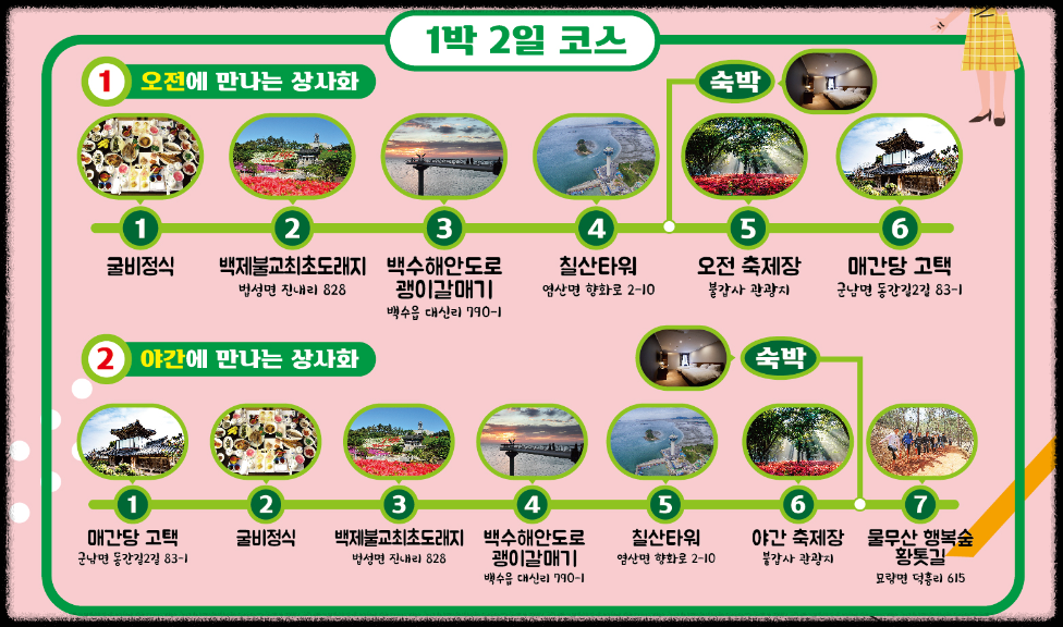 주변 관광지와의 연계: 불갑산 주변에는 백수해안도로, 법성포 굴비거리, 백제 불교 최초 도래지 등 다양한 관광지가 있어 상사화축제와 함께 영광 여행을 더욱 풍성하게 즐길 수 있습니다.